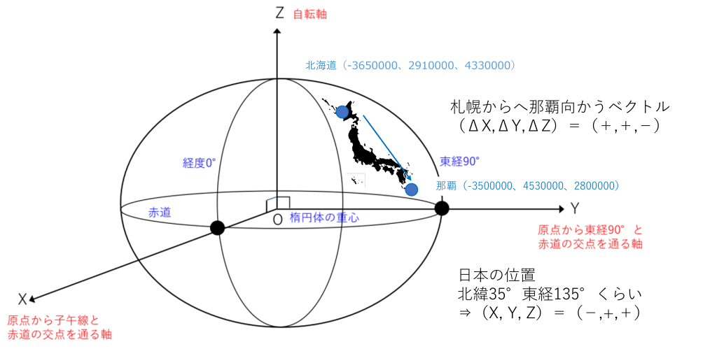 e. 日本列島の位置をITRFで表すと、X, Y, Zの値域は、X < 0, Y >0, Z > 0(〇)であり、札幌市役所から那覇市役所に向かうベクトル(ΔX, ΔY, ΔZ)の符号は(負、正、負)(×→(正、正、負))となる。